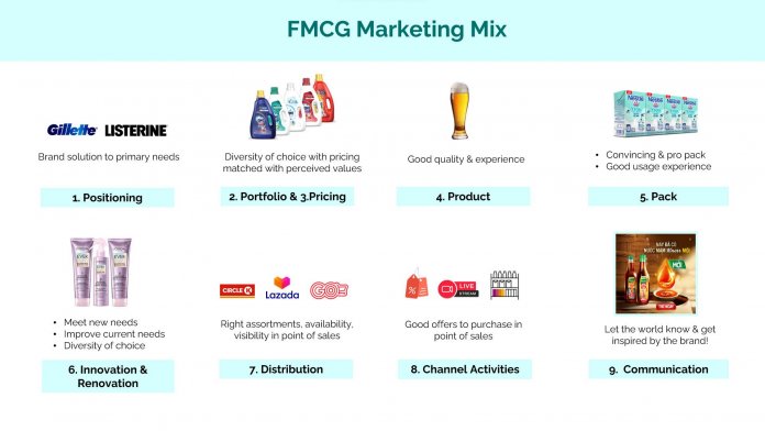 Mô hình chiến lược Marketing Mix hay nói cụ thể hơn là chuỗi giá trị của ngành hàng tiêu dùng nhanh (FMCG) xoay quanh 9 yếu tố quan trọng, và đây cũng là cơ sở để các thương hiệu xây dựng chi tiết chiến lược Marketing Mix.